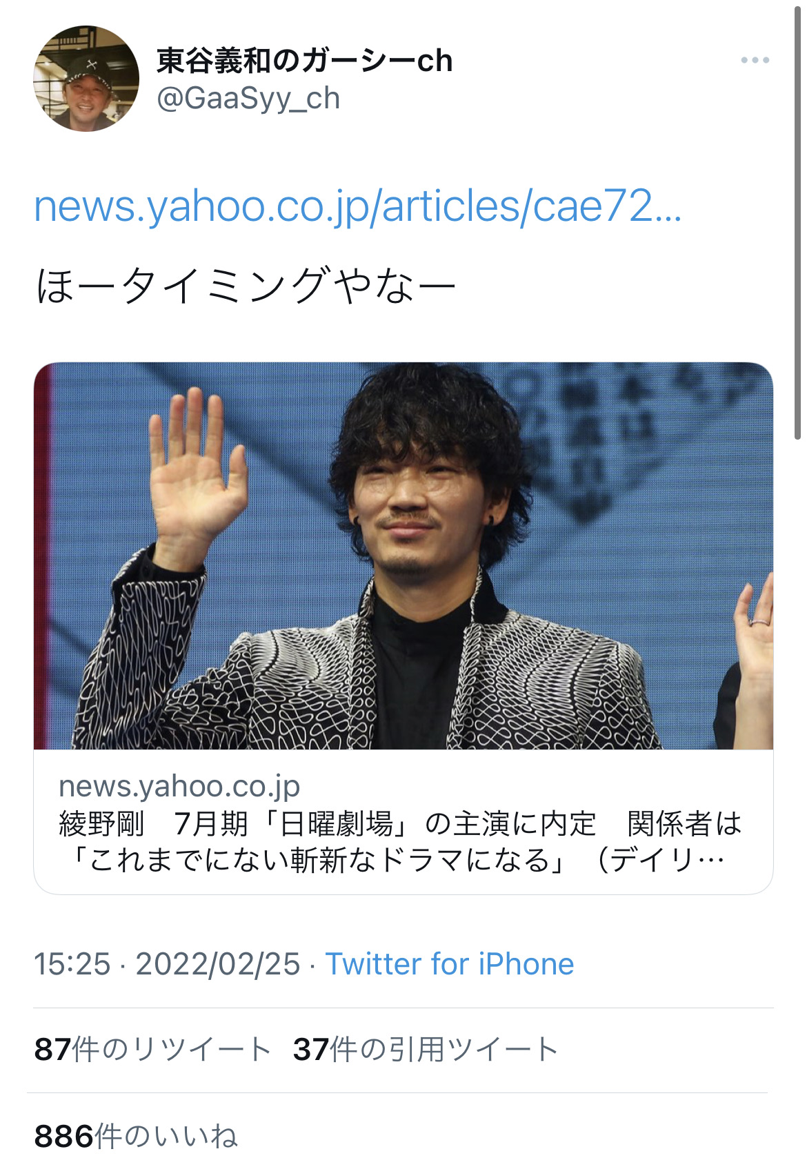 悲報 綾野剛さん、なぜか突然インスタグラムを消す