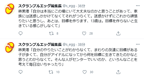 林美澪「自分のやりたいことがわからなくて、まわりの友達に目標がある子が多くて、自分がアイドルになってから何を目標に生きてきたのかなと思うとわからなくて。そんな人がセンターでいいのか、といろんなことを考えて毎日泣いちゃったり」