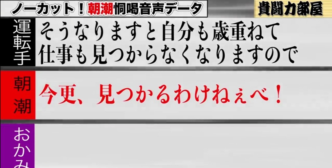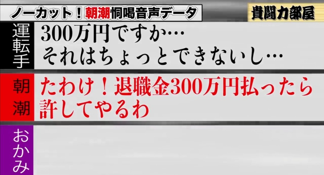 【悲報】相撲界にまたスキャンダルw「運転手を辞めたいだって…?辞めるなら退職金300万払え!!」ヤクザ音声が流出wwwwwwww