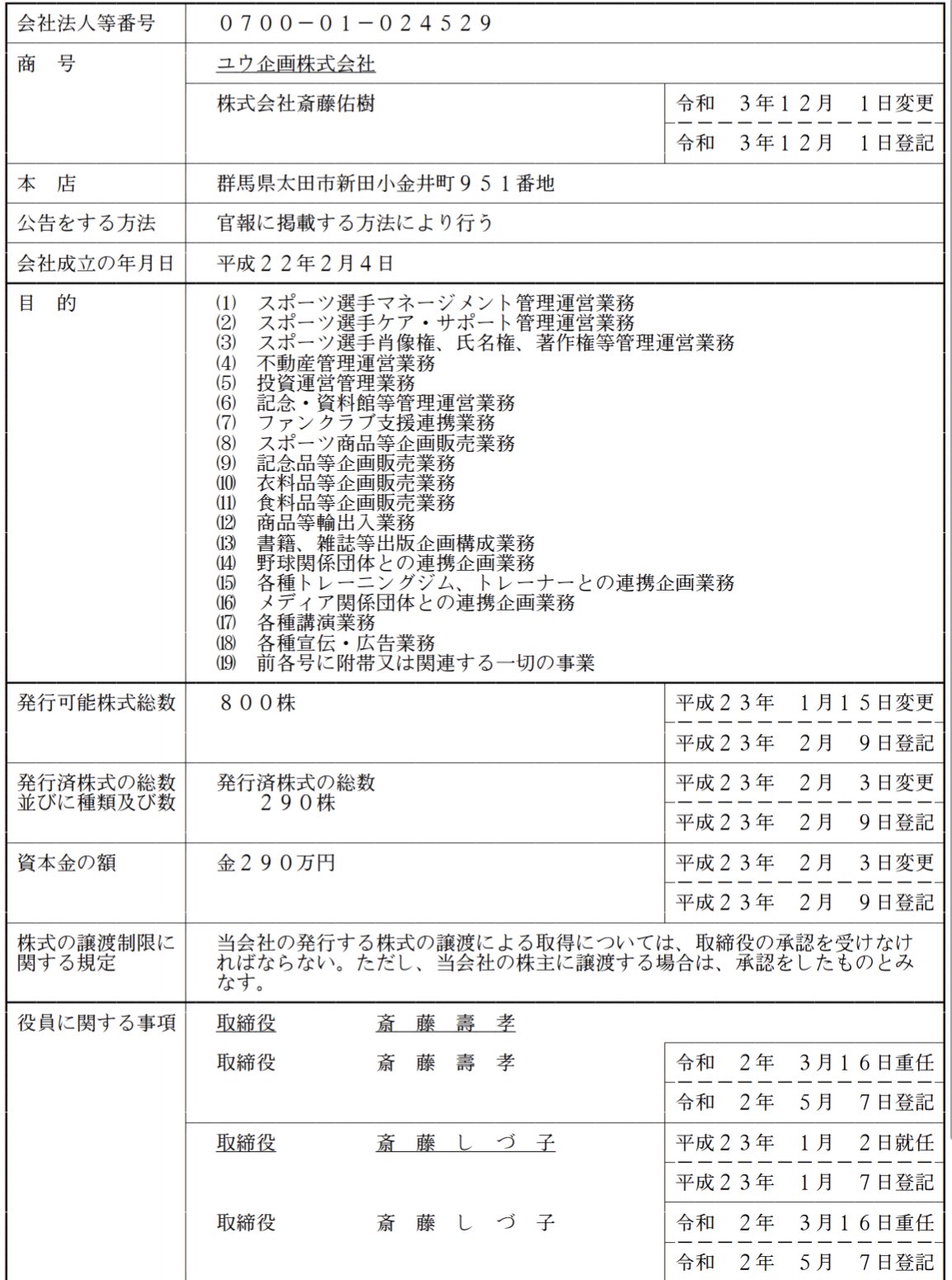 去年の12月にユウ企画から株式会社斎藤佑樹に商号変更してる