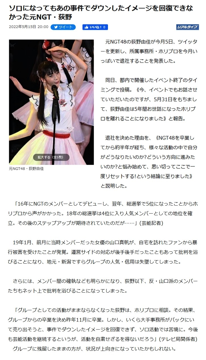 ソロになってもあの事件でダウンしたイメージを回復できなかった元NGT・荻野