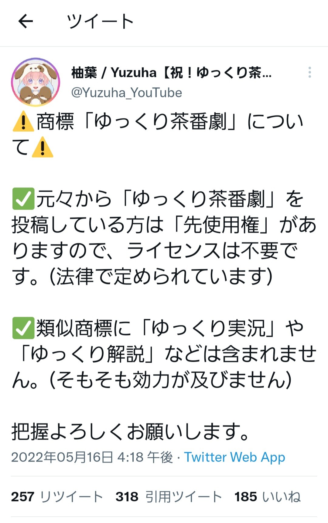 ・柚葉とかいう糞YouTuberが「ゆっくり茶番劇」を文字商標として登録