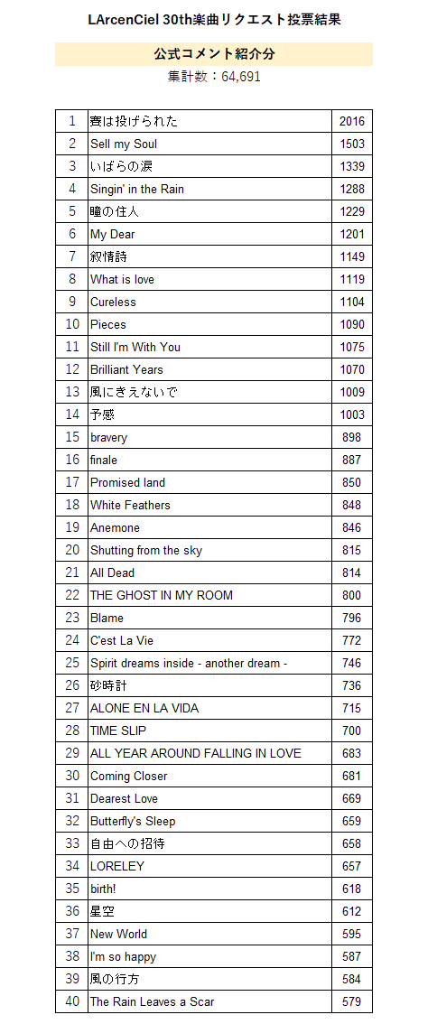 リクエスト投票の有志が集計してたけどこれの上位10曲のうち半分歌われなかったわおわりやで