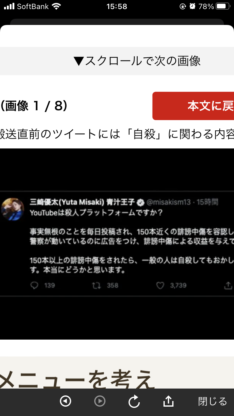 〈YouTubeは殺人プラットフォームですか? 事実無根のことを毎日投稿され、150本近くの誹謗中傷を容認しています。警察が動いているのに広告をつけ、誹謗中傷による収益を与えています。150本以上の誹謗中傷をされたら、一般の人は自殺してもおかしくないです。本当にどうかと思います。〉