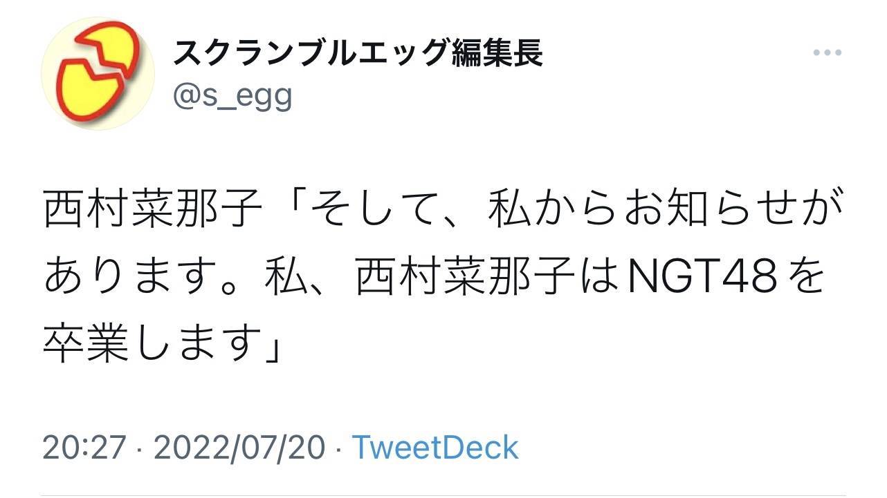 「このタイミングで7年間お世話になったNGTという大きな船を降りて別の場所に身を置いて頑張っていきたいと思います。最終活動日は9月末を予定しております。卒業後も芸能活動は続けるんですけど、アイドルの活動は残り2ヵ月ちょっとなので最後まで応援してくださるとうれしいです」