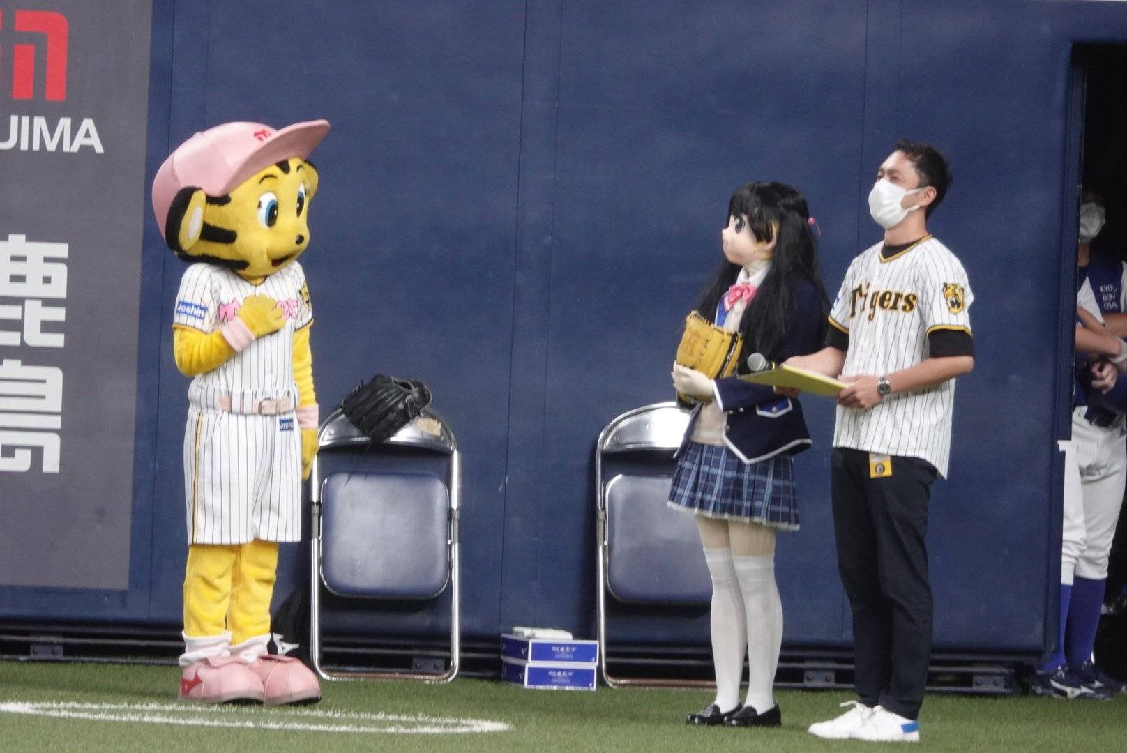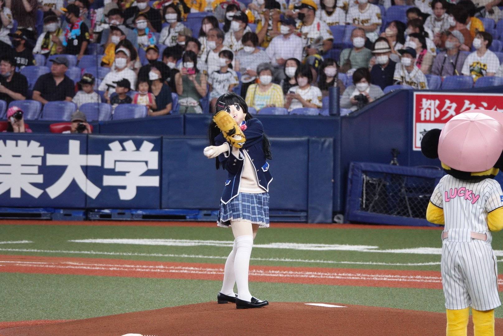 所属タレントでバーチャルライバー(ライブ配信を行う人)の月ノ美兎(つきのみと)の配信に度々登場する謎ノ美兎がファーストピッチセレモニーに登場した。