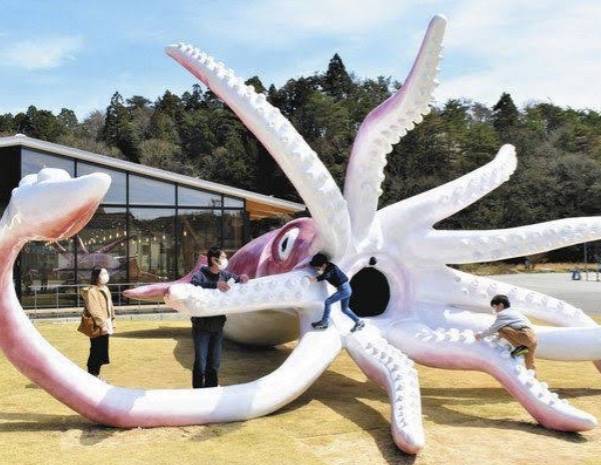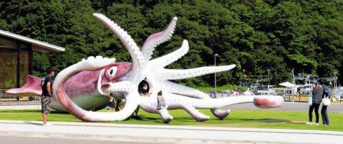 (愛称・イカの駅つくモール)」に作られた巨大なスルメイカのモニュメントについて、