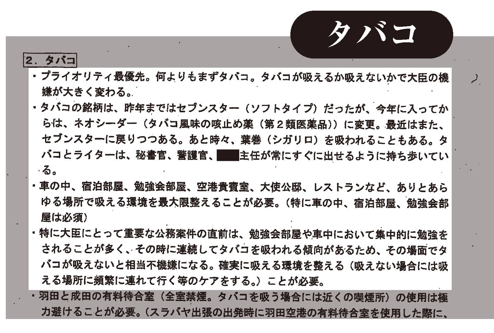 プライオリティ最優先。何よりもまずタバコ。タバコが吸えるか吸えないかで大臣の機嫌が大きく変わる