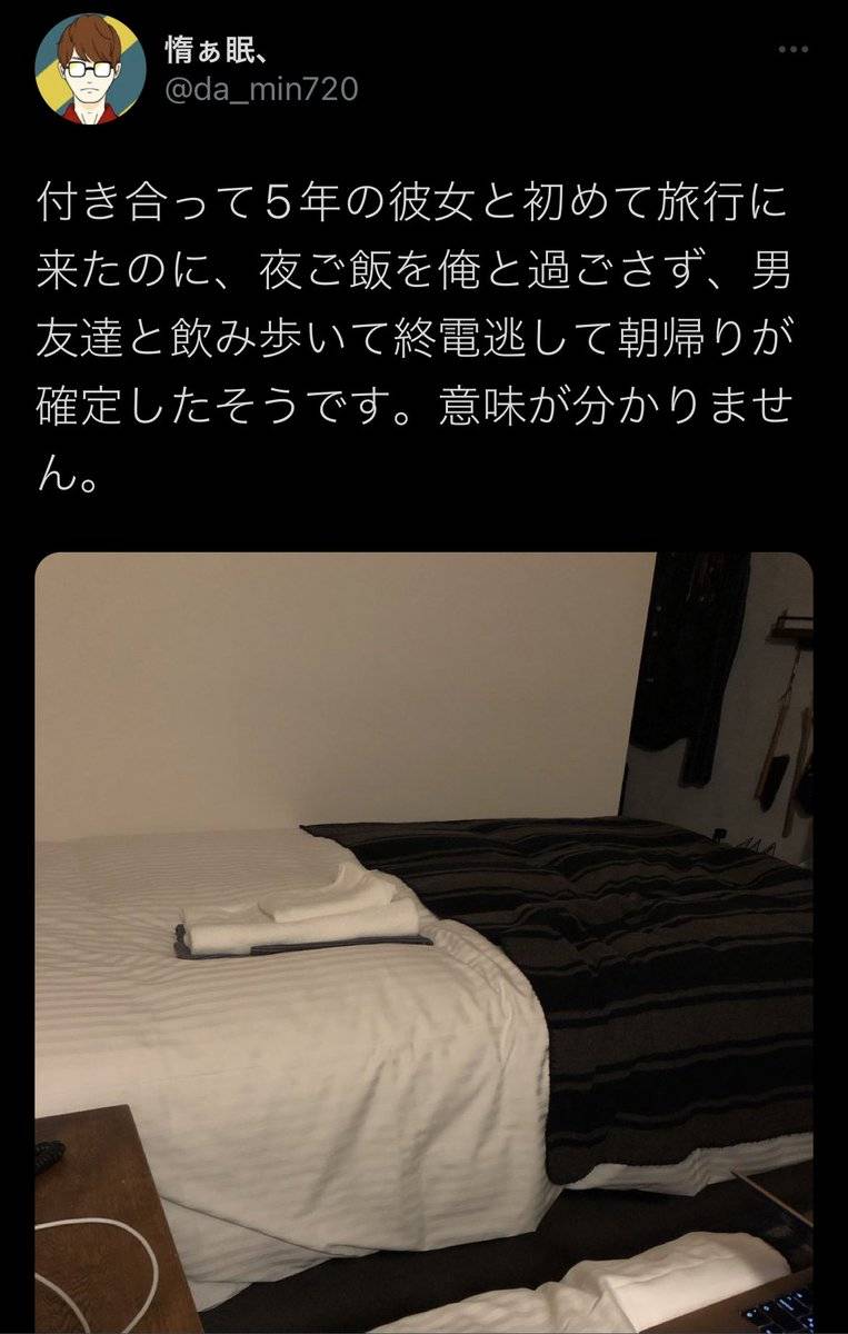 付き合って初めて旅行に行ったけど夕食の時間に彼女がどっか行って朝帰ってきたんやろ