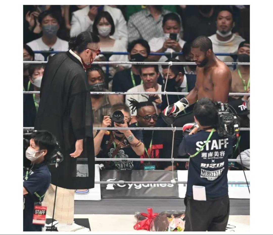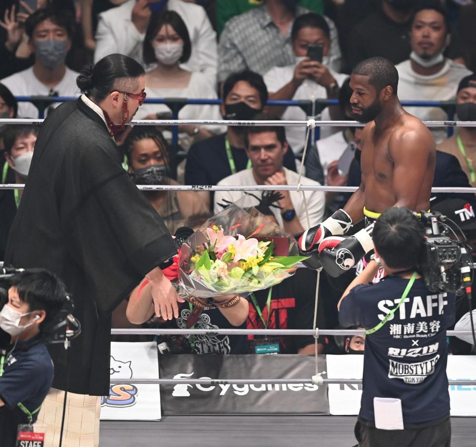 同日に行われた「超RIZIN/RIZIN.38」で、フロイド・メイウェザー(45)と朝倉未来(30)の試合前に、デジタルチケットを420万円で購入してメイウェザーへの花束贈呈役を務めた政治団体「ごぼうの党」の奧野卓志代表が、メイウェザーの目の前で花束をリングに投げ捨てた。