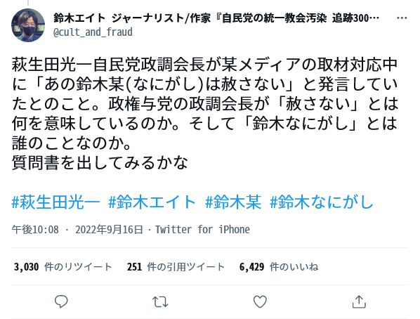 鈴木エイト ジャーナリスト/作家『自民党の統一教会汚染 追跡3000日』9/26発刊(小学館)