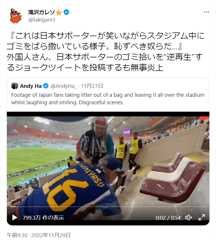 外国人さん、日本サポーターのゴミ拾いを“逆再生”するジョークツイートを投稿するも無事炎上 https://t.co/nNN4sK48gT