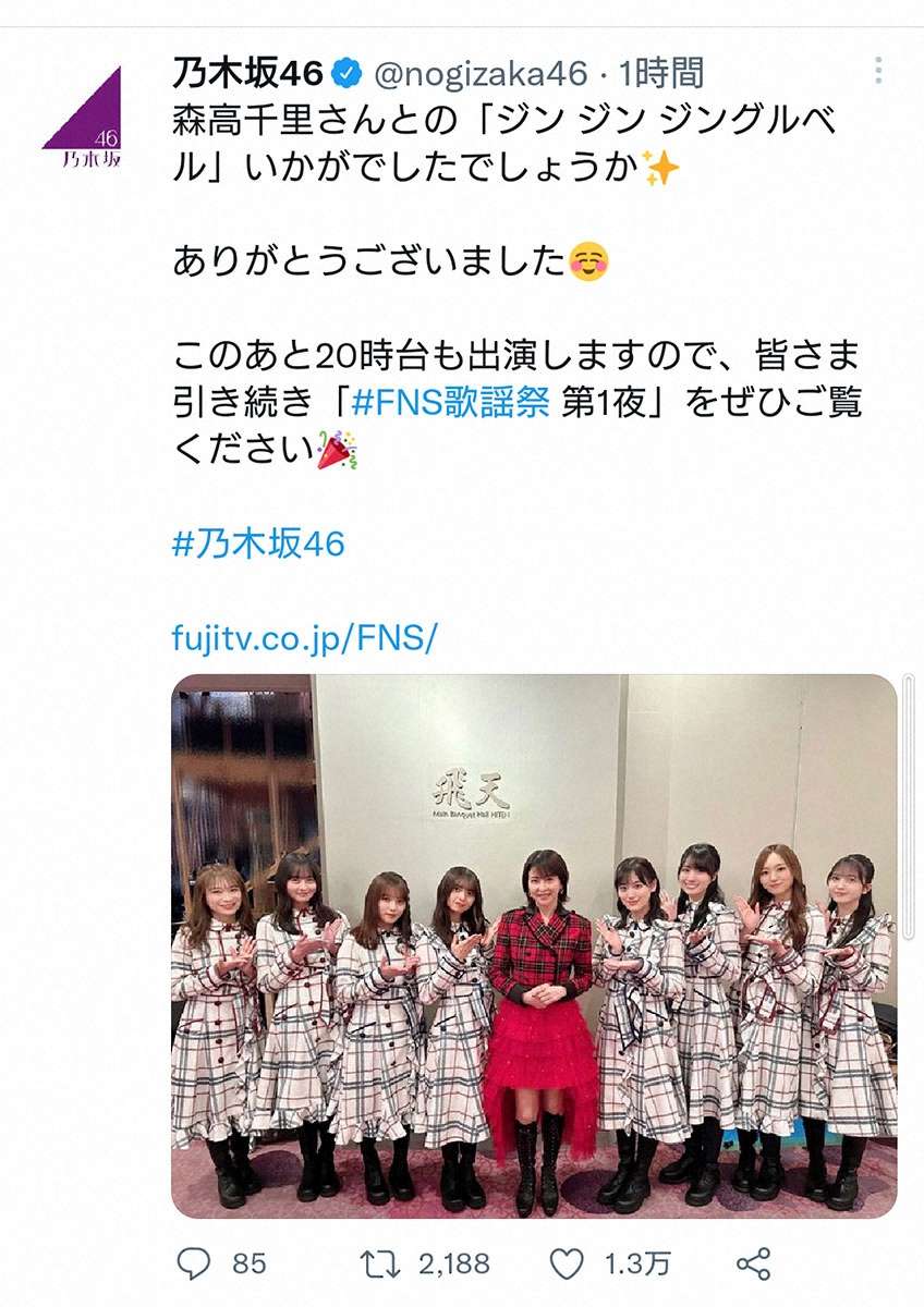 森高は赤いミニスカート姿で、白の衣装を着た乃木坂46と「ジン ジン ジングルベル」を披露。