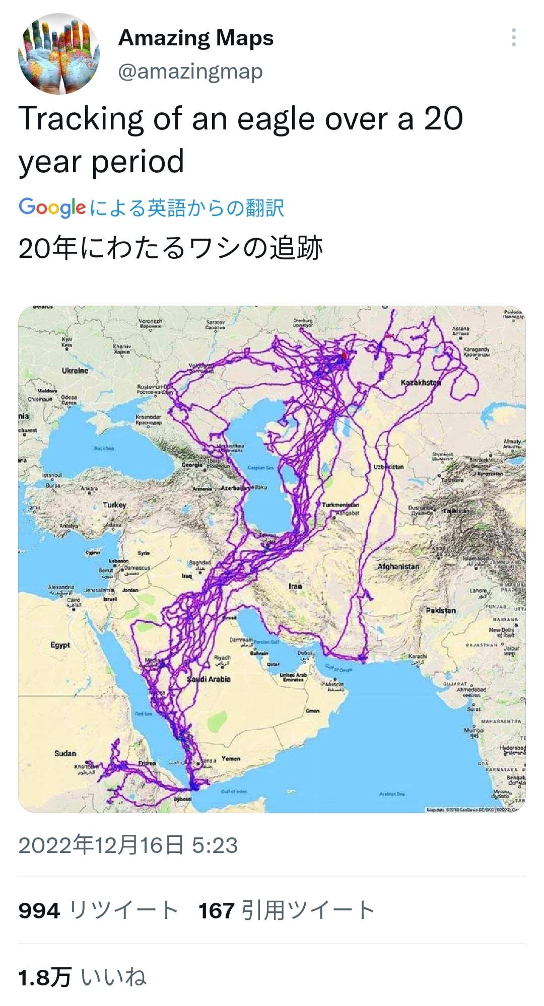 【画像】ワシにGPS付けて20年間追跡した結果がこちら | ヤバイ!ニュース(・∀・)
