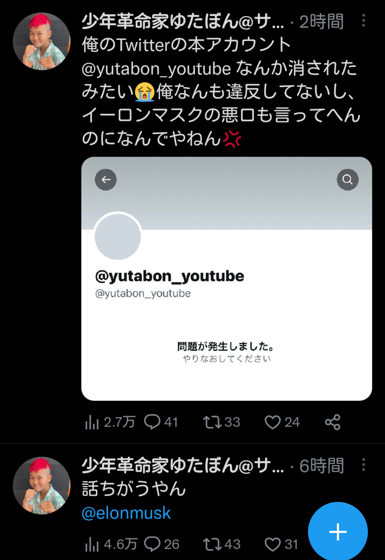 ゆたぼんさんは新アカウントで23日に「話ちがうやん @elonmusk」「俺なんも違反してないし、イーロンマスクの悪口も言ってへんのになんでやねん」ともツイートし、ツイッター社を買収した実業家のイーロン・マスク氏に抗議している。