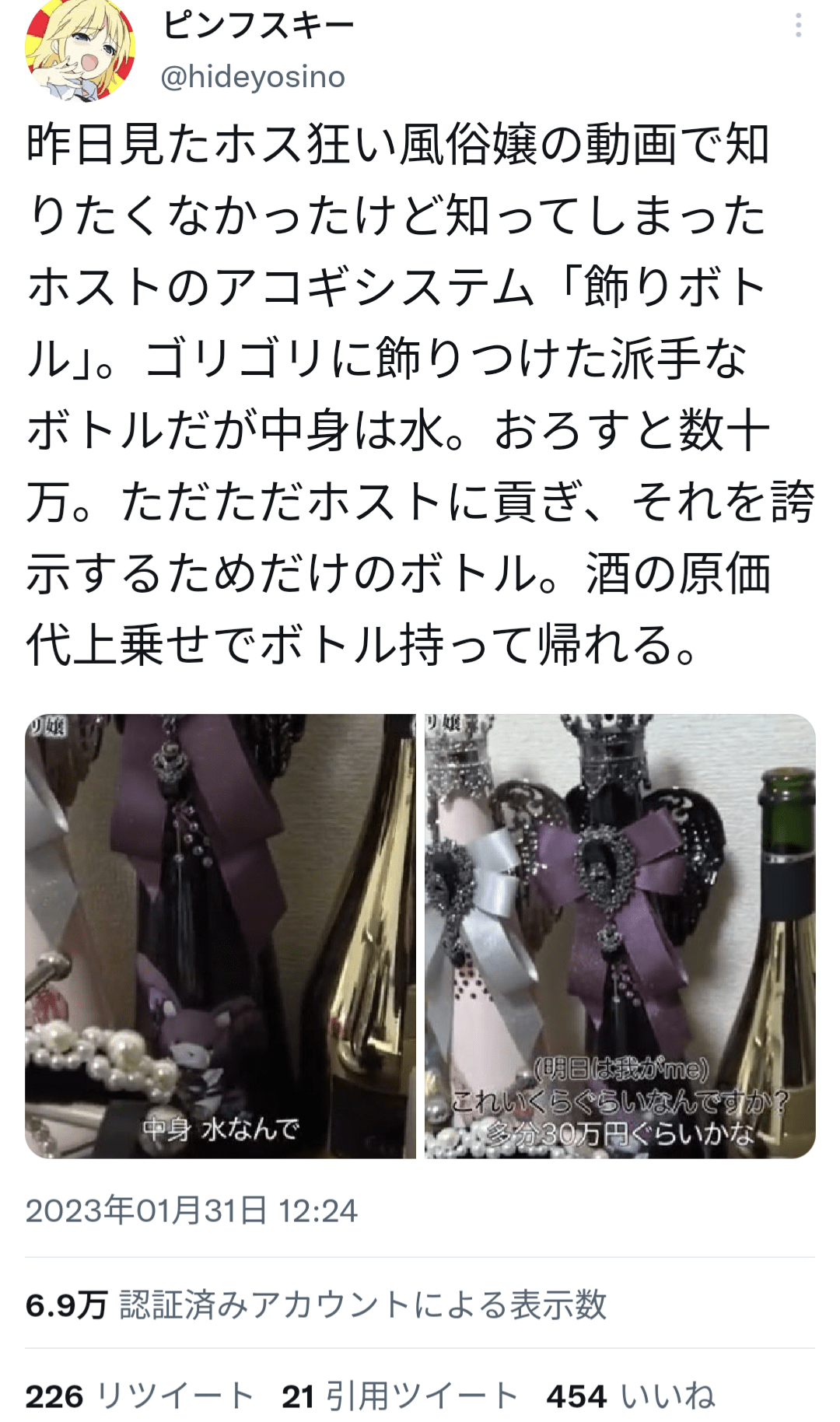 【悲報】ホスト、壺ならぬ「瓶」だった 水の入った酒瓶を数十万円で女に売りつけている模様 | ヤバイ!ニュース(・∀・)