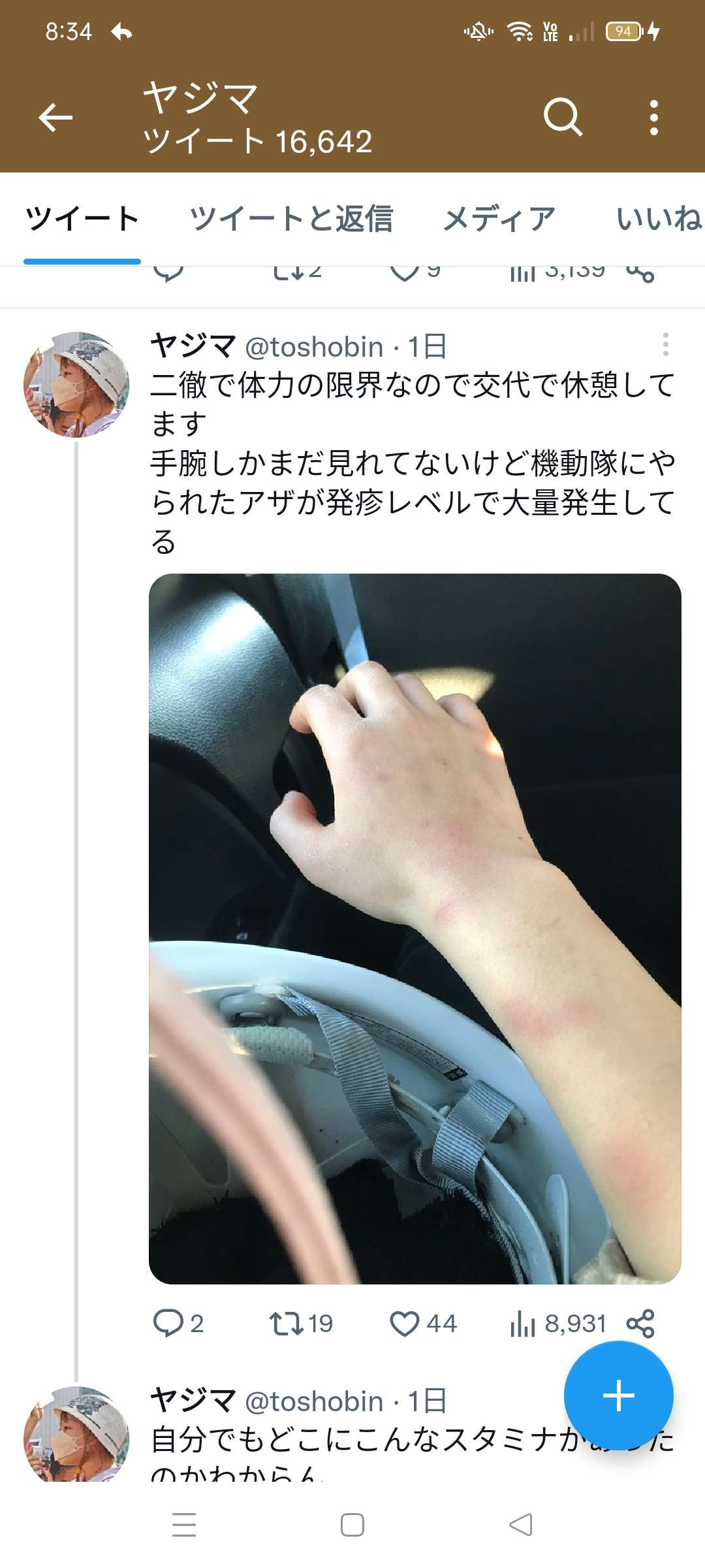 一昨日から昨日にかけての成田空港滑走路拡張反対運動で機動隊ともみくちゃになって負傷した様子