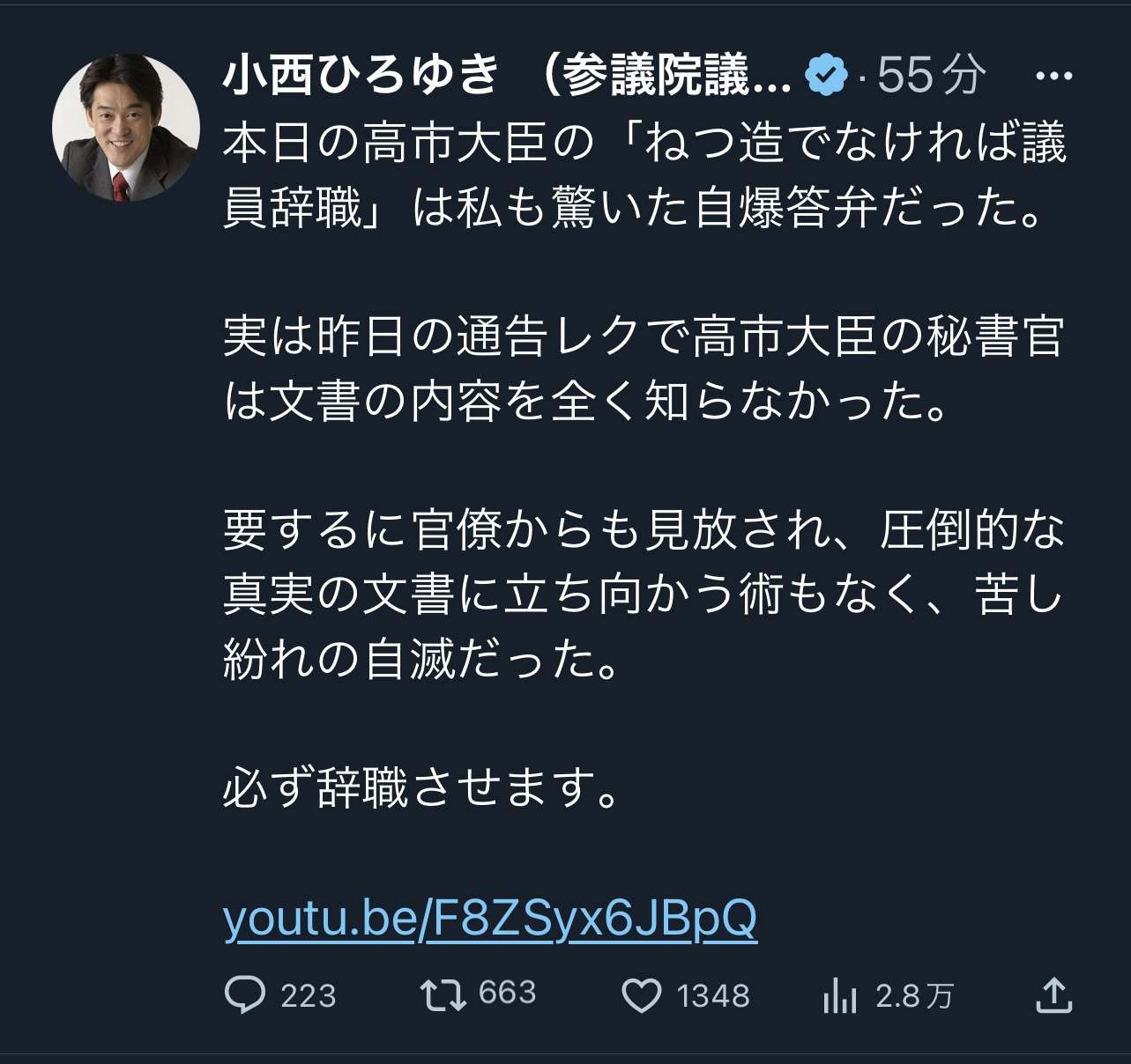 森友の時、安倍総理の事実無根、事実なら辞職する との発言からモリカケ問題が今でも細々続いて6年目。 野党は事実なんて関係なく言いがかりのネタ文句垂れる理由が欲しいだけ。 事実小西先生は過去に政権なんか欲しくない云々公言してるし。