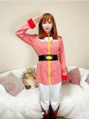 「地球連邦軍に入隊しました」と記し、「機動戦士ガンダム」地球連邦軍の赤の女子制服コスチューム姿で敬礼している写真をアップした。