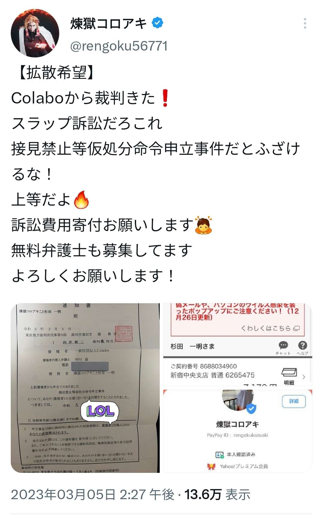 【悲報】煉獄コロアキさん、Colaboに接近禁止の仮処分命令通知が届く