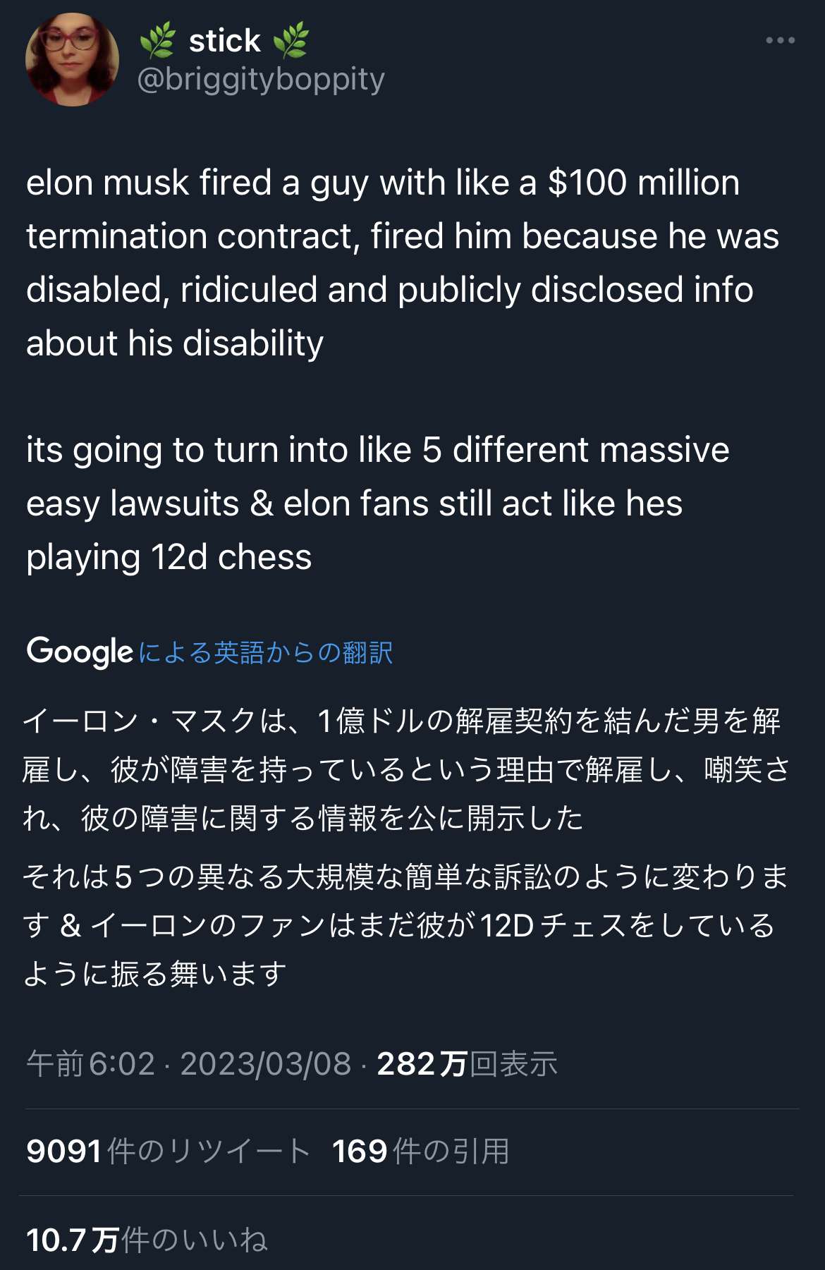 イーロン・マスクは、1億ドルの解雇契約を結んだ男を解雇し、彼が障害を持っているという理由で解雇し、嘲笑され、彼の障害に関する情報を公に開示した