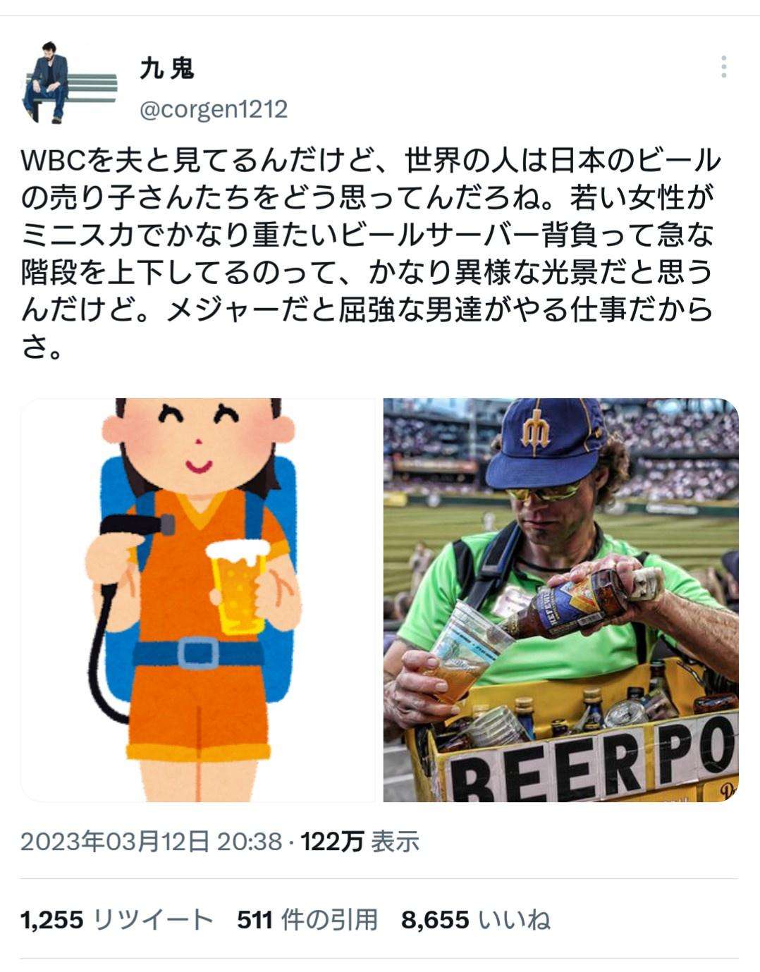 WBCを夫と見てるんだけど、世界の人は日本のビールの売り子さんたちをどう思ってんだろね。