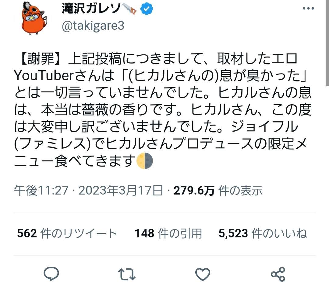 【謝罪】上記投稿につきまして、取材したエロYouTuberさんは「(ヒカルさんの)息が臭かった」とは一切言っていませんでした。ヒカルさんの息は、本当は薔薇の香りです。ヒカルさん、この度は大変申し訳ございませんでした。ジョイフル(ファミレス)でヒカルさんプロデュースの限定メニュー食べてきます🌗