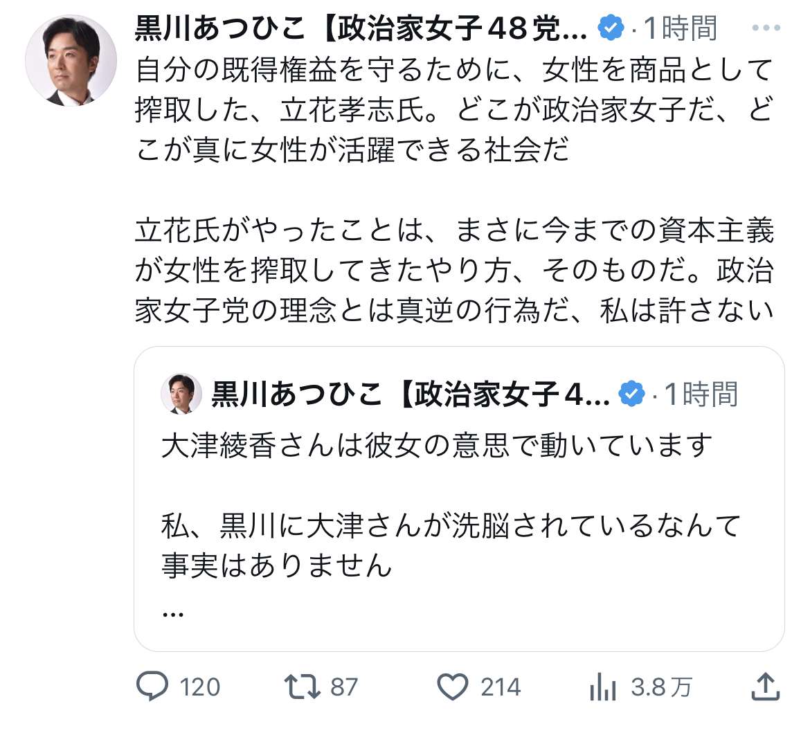 立花嫌いで黒川単体で応援したい奴多いやろ