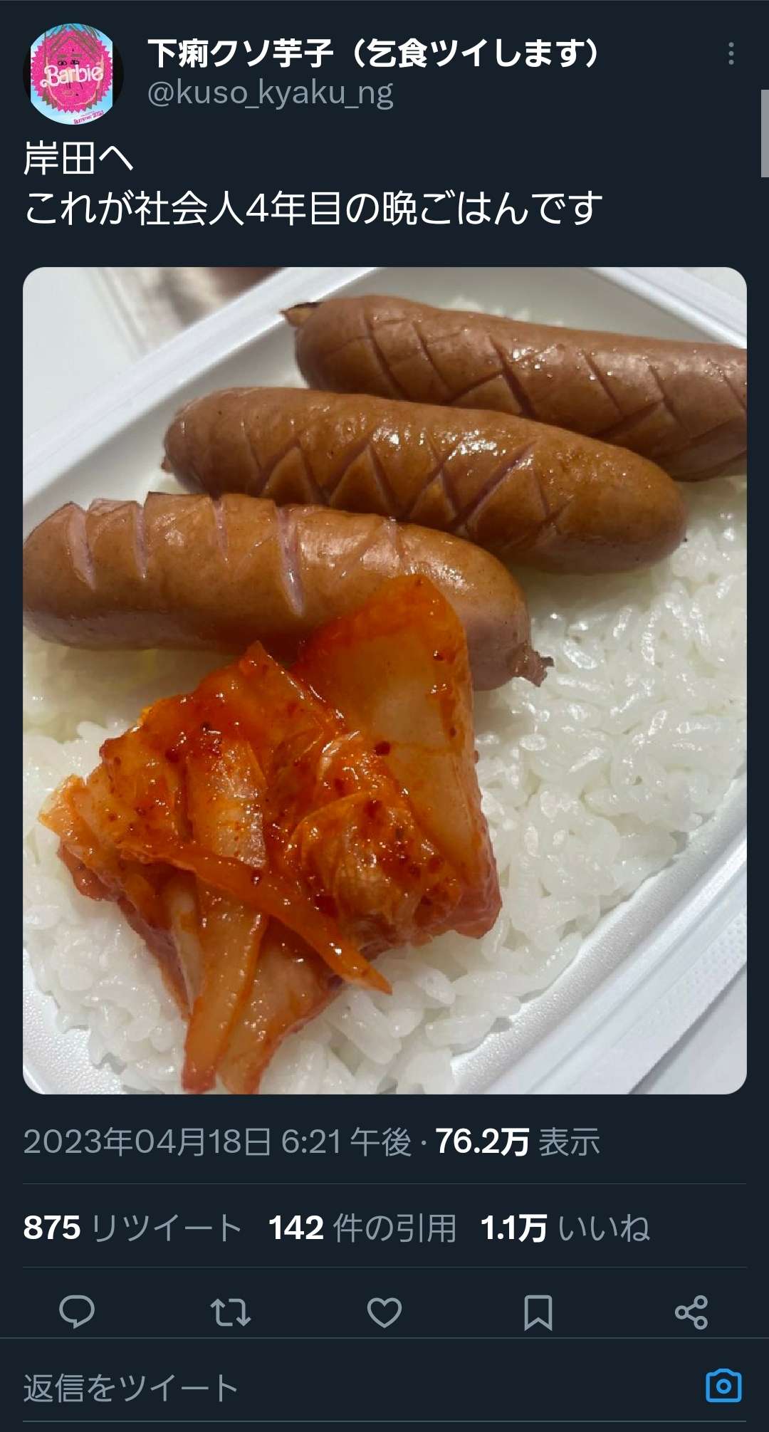 【画像】Twitter民「岸田へ。これが社会人4年目のご飯だよ。」← 話題にWWWWWWWWWWWWWWWW