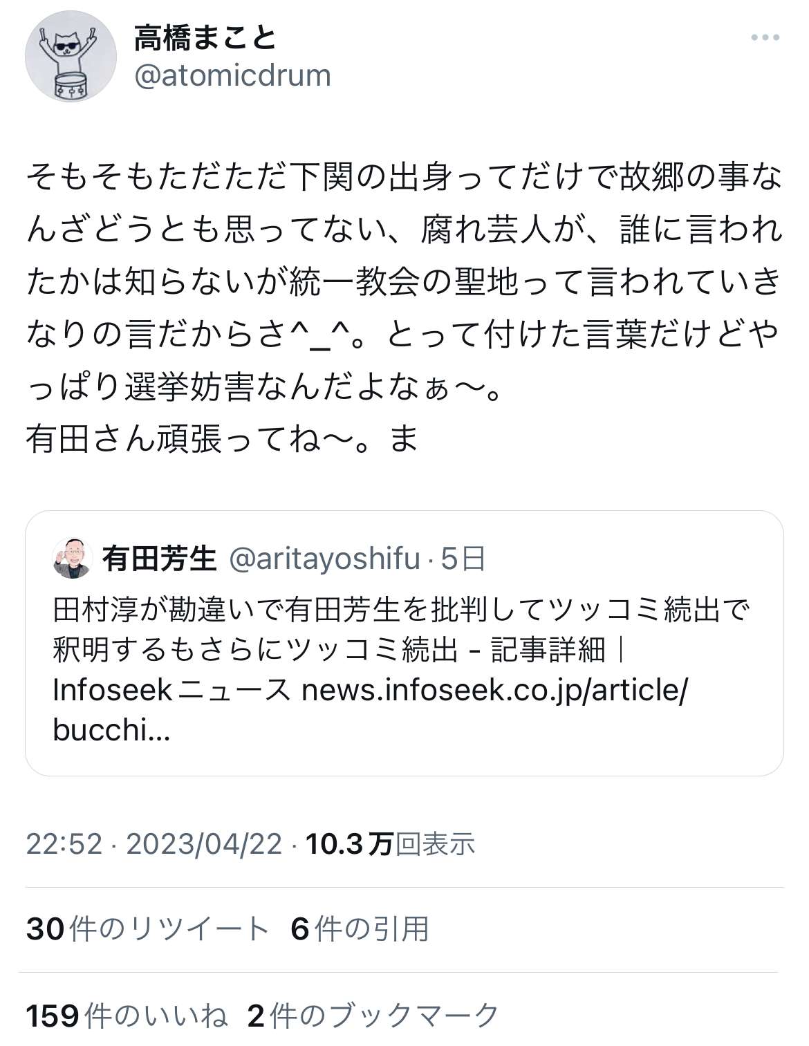 統一協会の構成員に成り下がったタムラアツシは腐れ○○と言われても仕方ないな