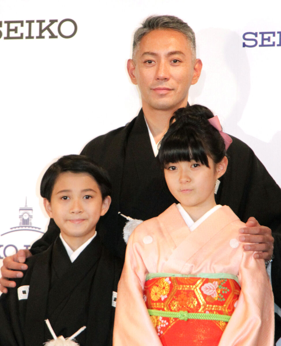 歌舞伎俳優の市川團十郎が9日、都内で「SEIKO 時と日本文化プロジェクト発表会」に長女の市川ぼたん、長男の市川新之助と...