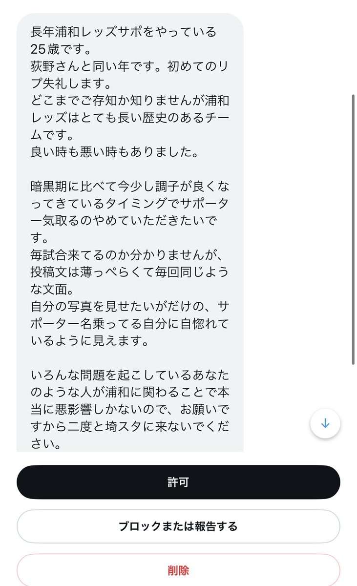 そんな荻野さんは、21日午前に自身のツイッターアカウントを更新。「浦和サポーター気取るのをやめてほしい」、「二度と埼スタに来ないで」、「ユニフォーム似合っていない」といったDMを公開するとともに