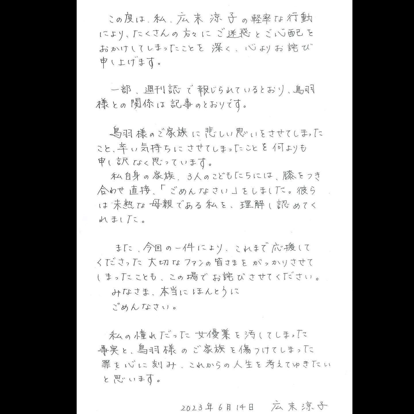 この度は、私、広末涼子の軽率な行動により、たくさんの方々にご迷惑とご心配をおかけしてしまったことを深く、心よりお詫び申し上げます。