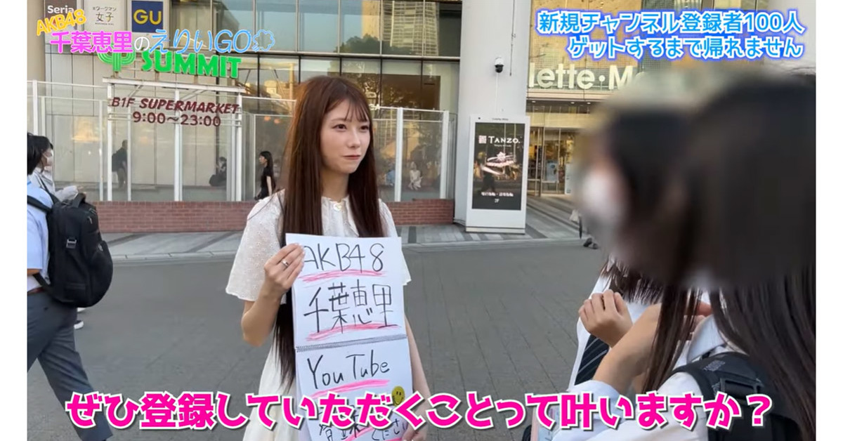 先の動画では、YouTubeチャンネル「AKB48 千葉恵里のえりいGO!」のチャンネル新規登録者100人を獲得できるまで帰れないというルールで、