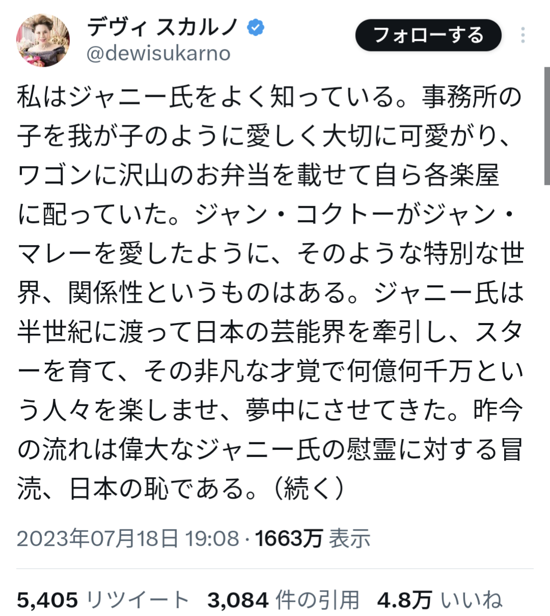【女】デヴィ・スカルノ「ジャニーさんを叩く奴は日本の恥」← 4.8万いいね