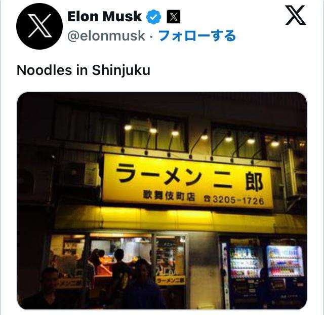 また、イーロン・マスク氏は無類のラーメン二郎好きとしても知られており、今回の来日でラーメン二郎でラーメンを食べることを目的のひとつにしている可能性もある。
