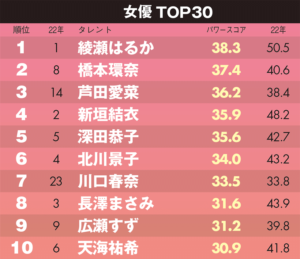 1位は3年連続となる綾瀬はるかだったが、ずっと続いていた綾瀬はるか・新垣結衣世代の30代女優による上位独占の牙城が崩れて、
