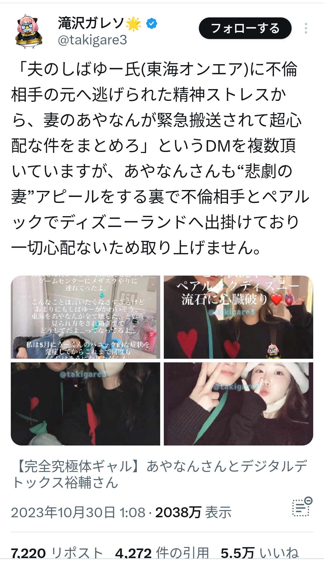 そもそも「夫はこんなに精神的に追い込まれておかしかった!東海オンエアの奴らは知らないだろうけど私だけは知ってた!」と後出し健気な妻ムーブしてたけど、そうすることで「大量の慰謝料とって離婚する」と突然SNS使って大騒ぎし始めて旦那を追い詰めた自分がいかに鬼畜かってことになるか、多分今も気が付いてないからな