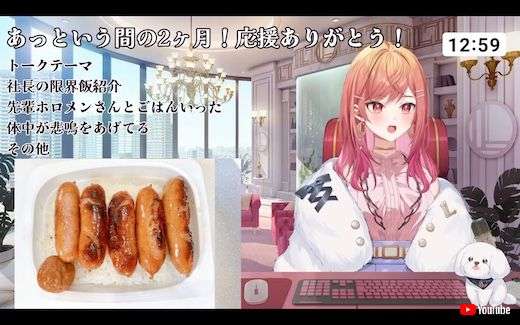 和やかな雑談が繰り広げられる中、配信画面に映された一条さんのランチは、レンチンしたパックご飯に焼いたウインナーと梅干しをのせただけ。