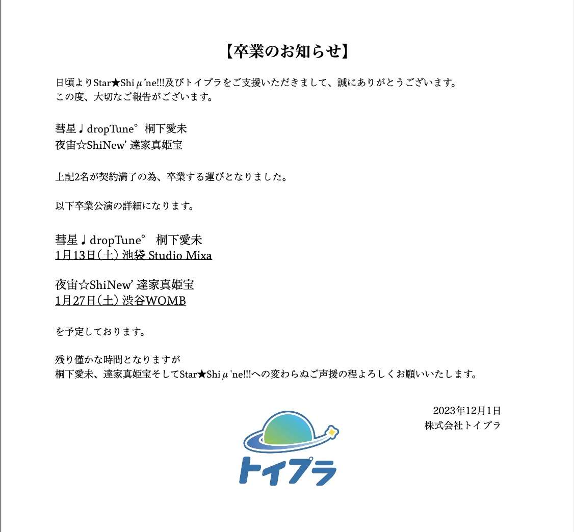 【桐下愛未 達家真姫宝 卒業のお知らせ】