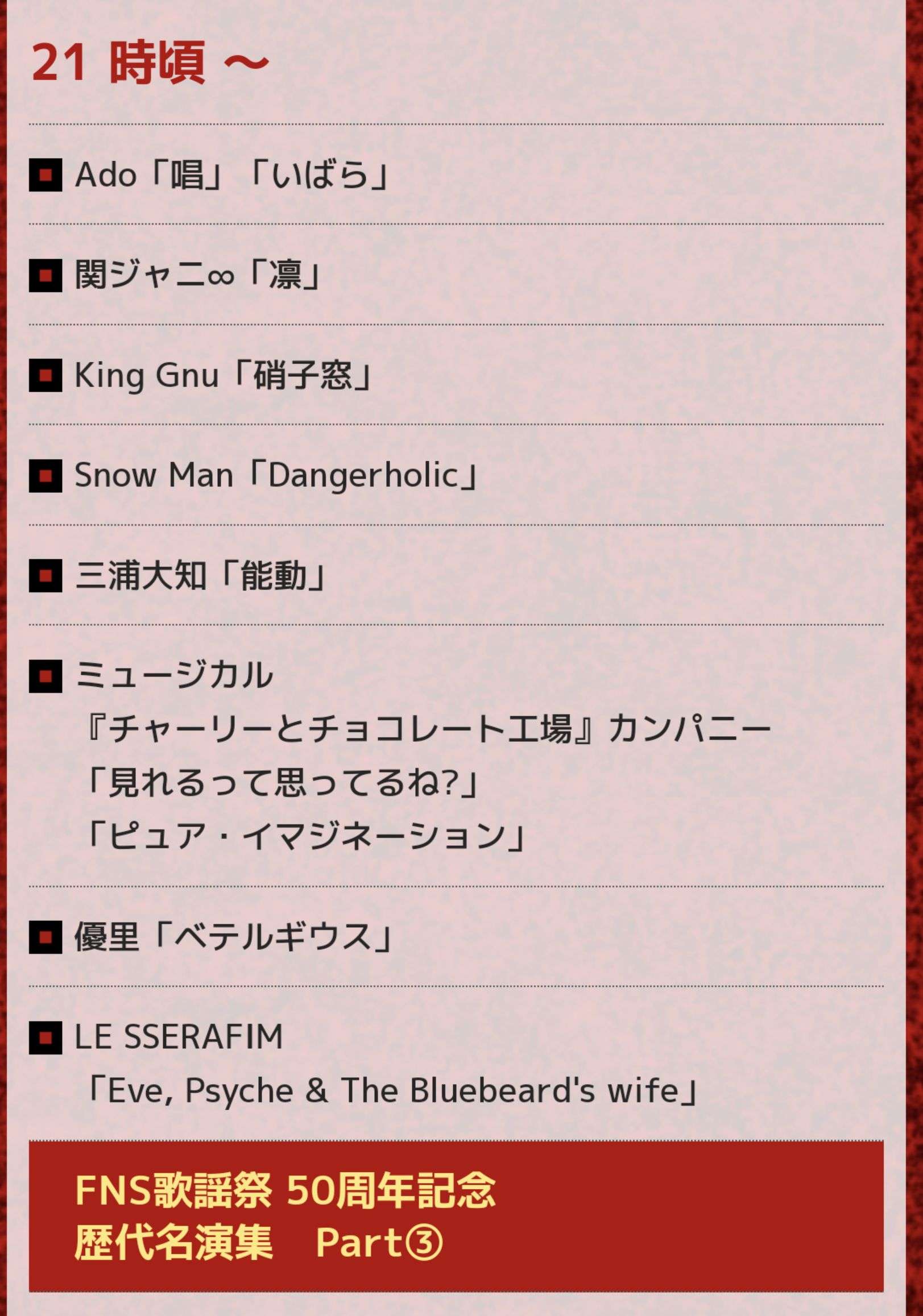 2024年12月4日 FNS歌謡祭 第1夜タイムテーブル