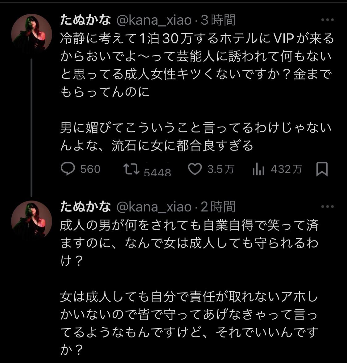 たぬかな「1泊30万円もするホテルのVIP部屋に誘われて付いて行って何もないと思ってる女がガイジ」