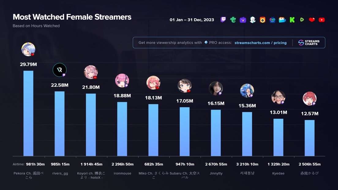 YouTube、Twitchなどの配信プラットフォームを分析するWebサイト・Streams Chartsで、2023年に配信が最も視聴された女性ストリーマーTOP10(※)が発表された。