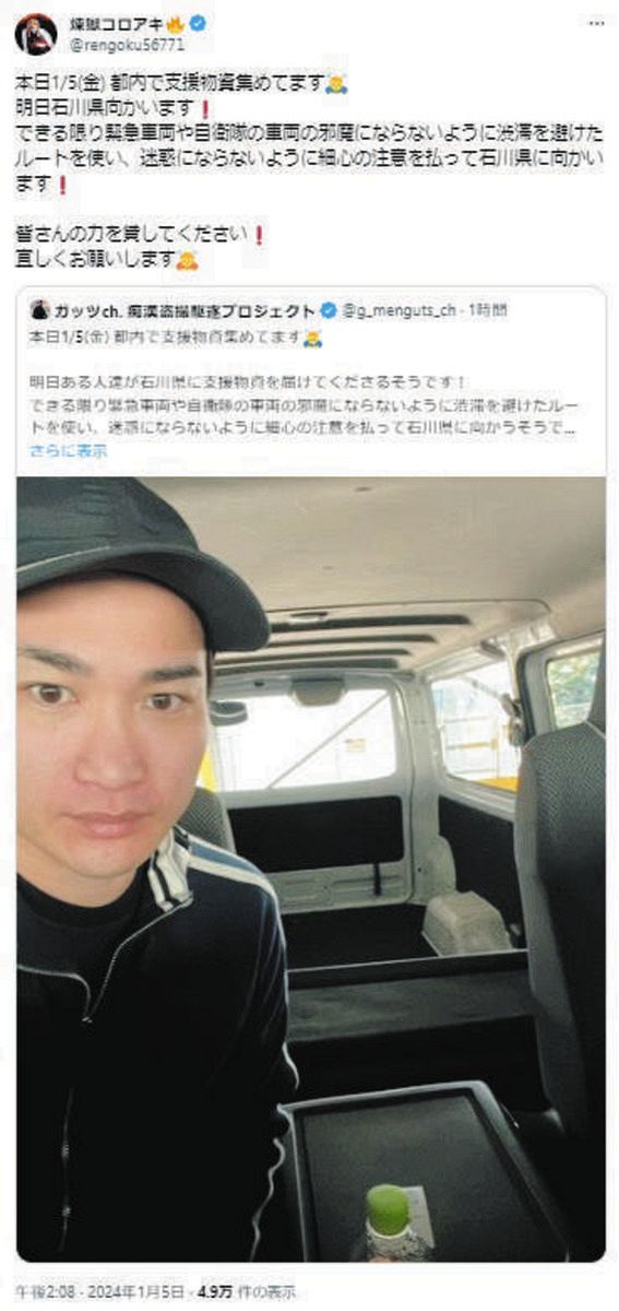 私人逮捕系YouTuber煉獄コロアキ、ガッツch中島蓮が能登半島地震の支援表明も…「邪魔になる」「自己満足」と批判殺到:中日スポーツ・東京中日スポーツ