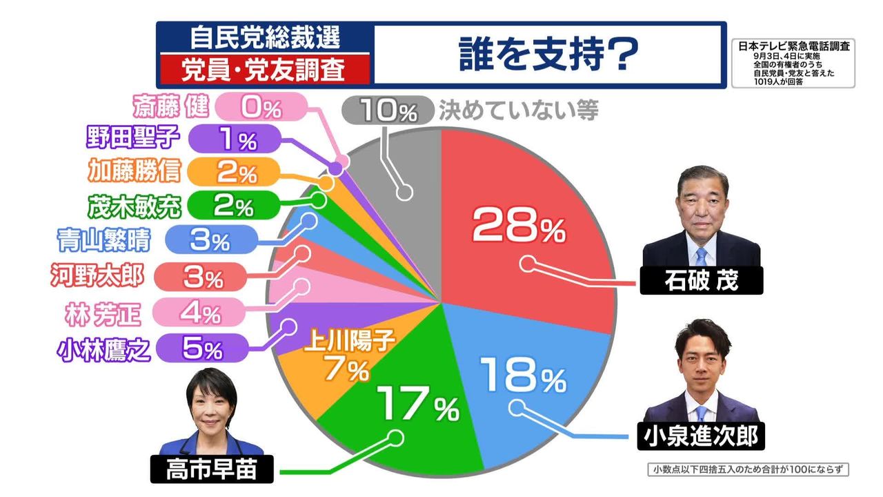 【独自】自民総裁選 石破氏が28%で1位 党員・党友調査(2024年9月5日掲載)|日テレNEWS NNN