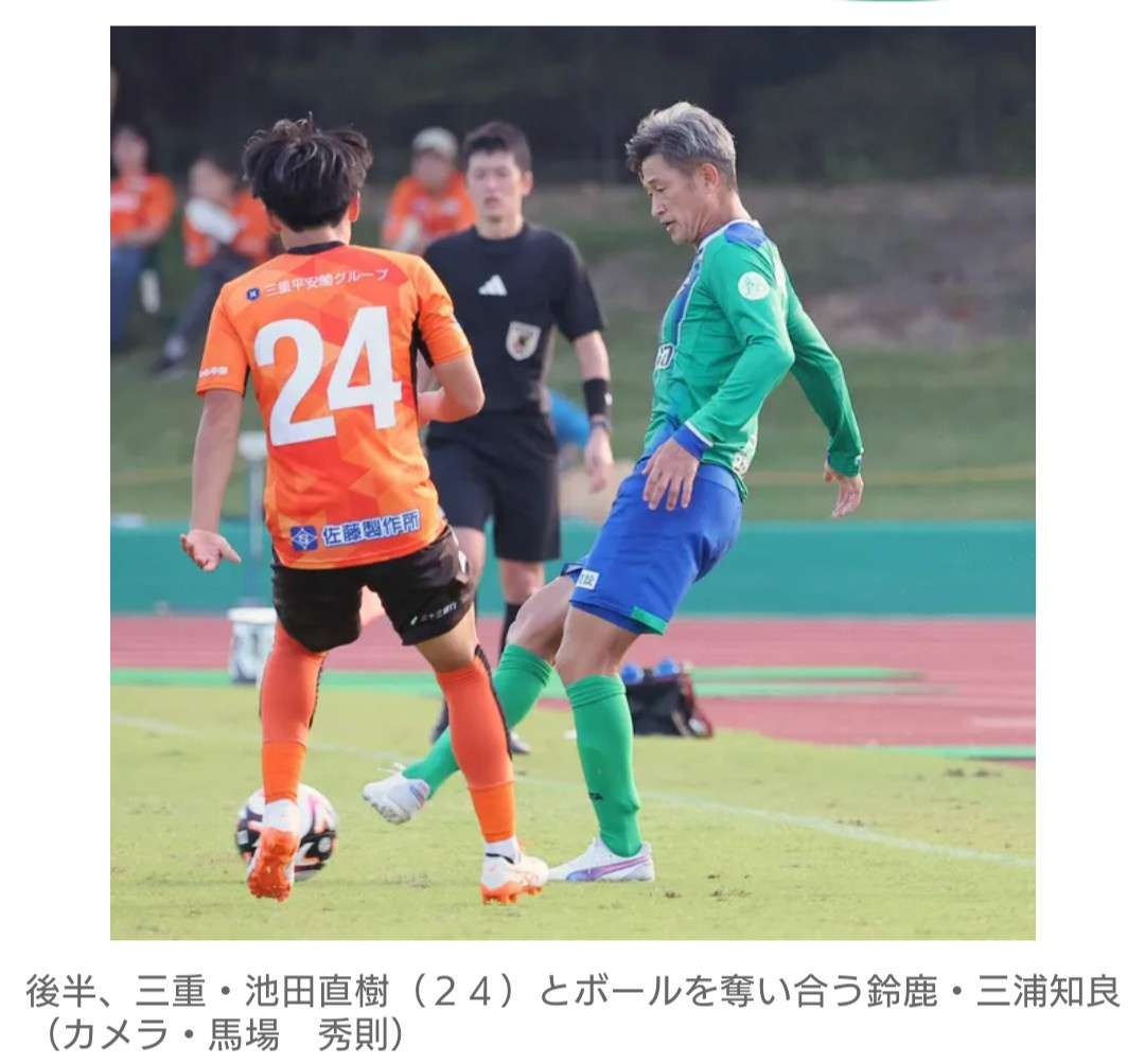 試合は2-0でアトレチコ鈴鹿クラブが勝利。三浦は3試合連続の途中出場となり、自身が持つ最年長記録を「57歳195日」に更新した。