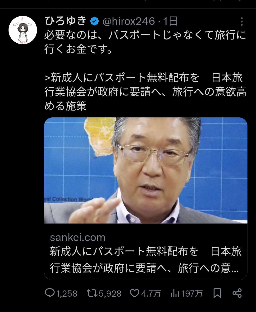 識者「若者にパスポート無料配布!」 ひろゆき「いや必要なのは金だろ🤔」