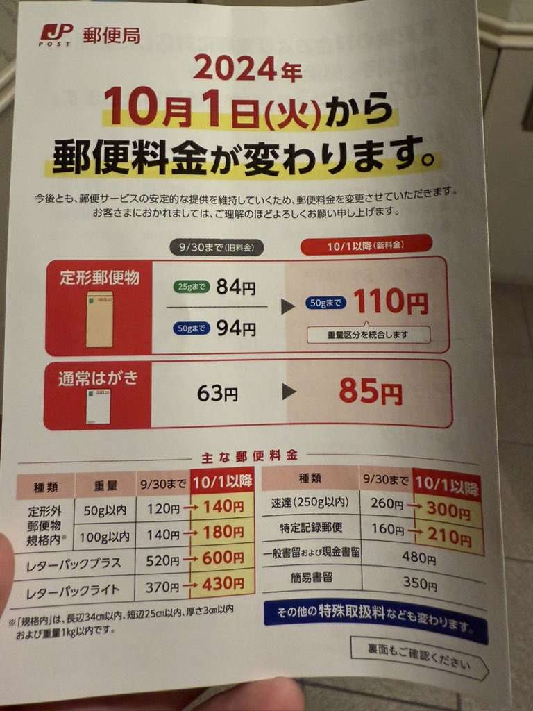 郵便局「ちな今手元に63円はがき持ってても、10月以降出すときは差額の22円切手貼り足してくださいね?それ用の切手も作ってあります🤗」
