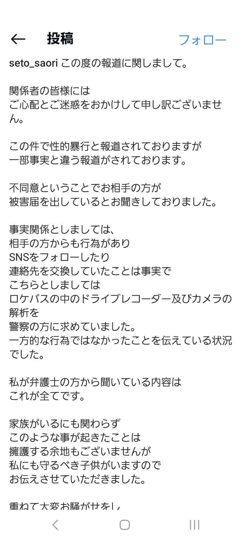 事実関係としましては、相手の方からも行為がありSNSをフォローしたり連絡先を交換していたことは事実でこちらとしましてはロケバスの中のドライブレコーダー及びカメラの解析を警察の方に求めていました。一方的な行為ではなかったことを伝えている状況でした。