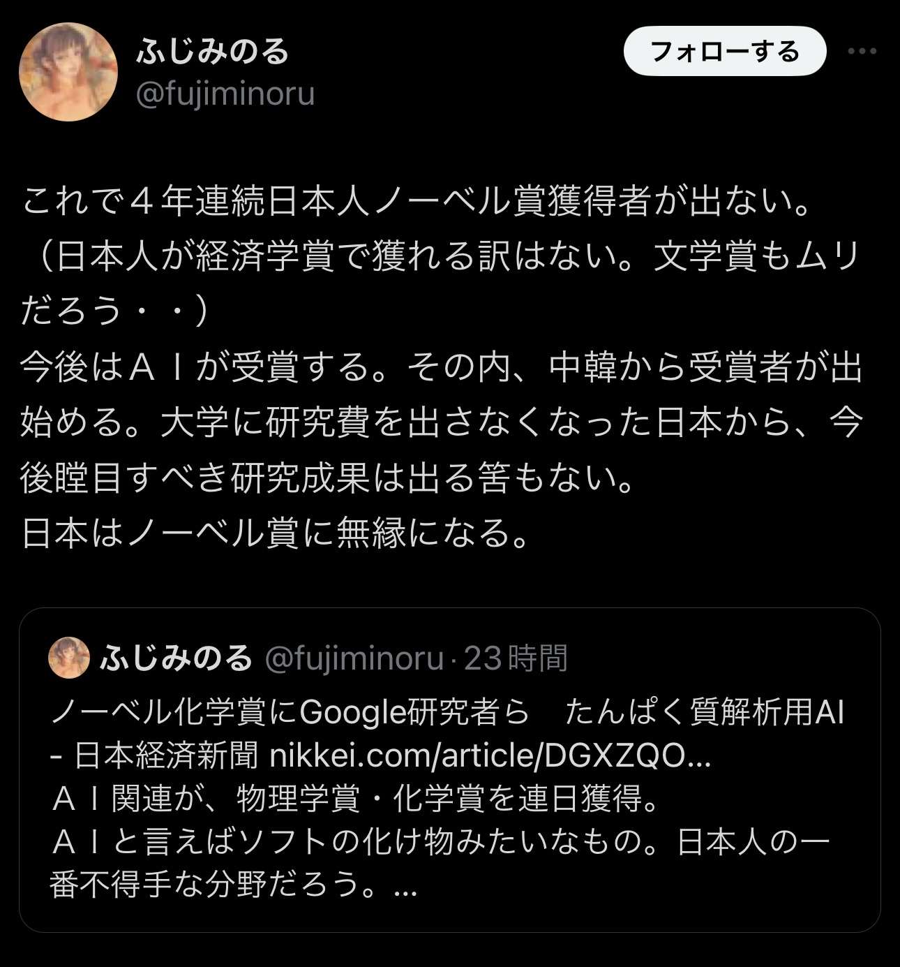 ノーベル賞取れないと死ぬみたいな過激なこと言ってんの韓国と村上春樹くらいじゃねえの